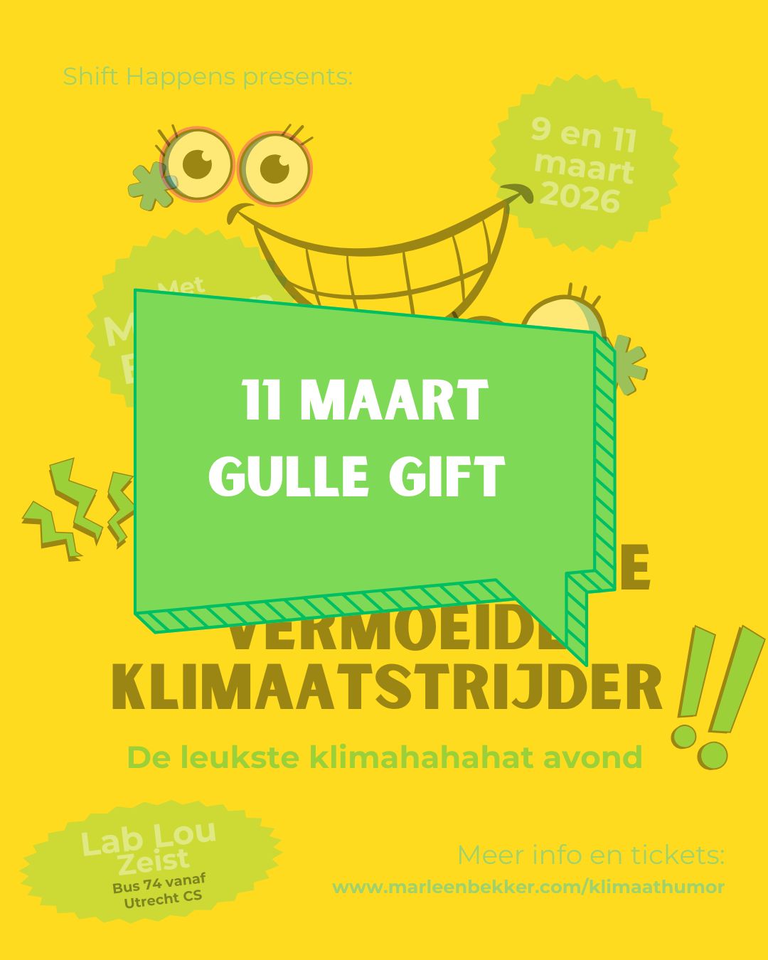 Yes, superleuk dat je erbij bent, bij die workshop Humor voor vermoeide klimaatstrijders op woensdag 11 maart 2026. Koop hier je kaartje met je Gulle Gift en je maakt iemand anders blij én je kunt de hele wereld weer aan!