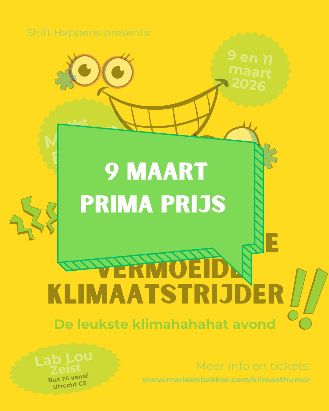 Yes, superleuk dat je erbij bent, bij die workshop Humor voor vermoeide klimaatstrijders op maandag 9 maart 2026. Koop hier je kaartje voor die Prima Prijs en je kunt de hele wereld weer aan!